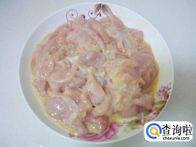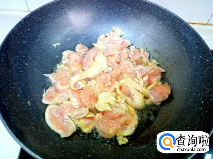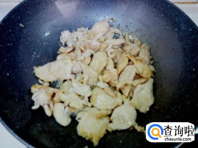 油四五成热时,放入挂糊的鸡胸肉,中火滑炒,炒至鸡胸肉变软,颜色微白,关火。
