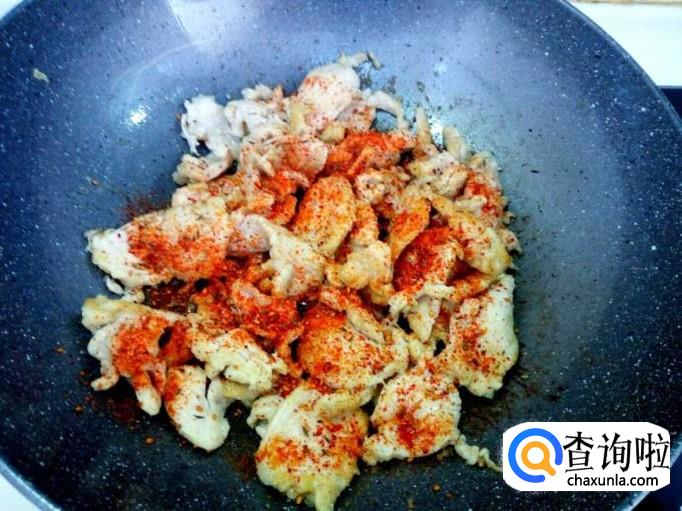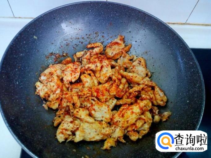 把烧烤调味料撒到炒好的鸡胸肉上,用勺略翻一下,使烧烤料均匀开。