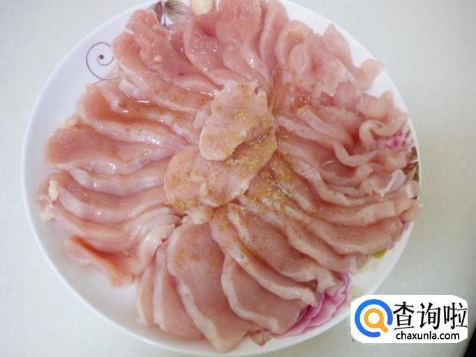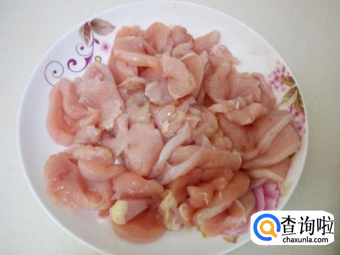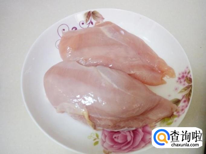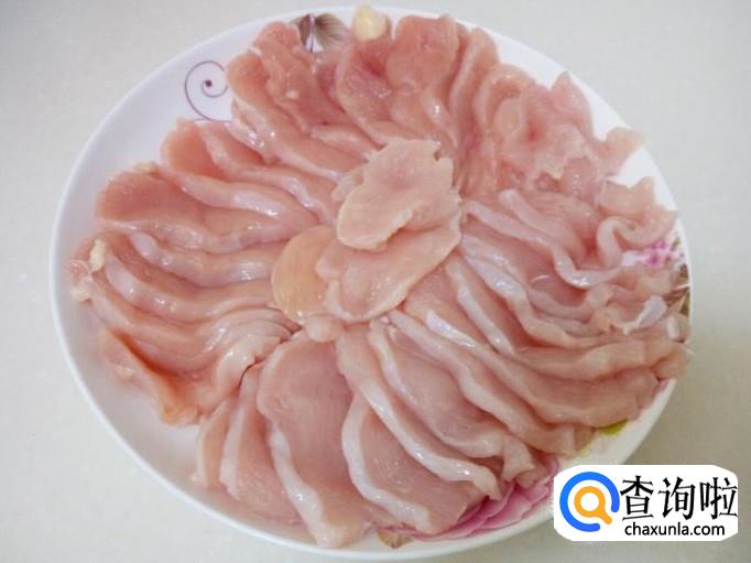 把鸡胸肉清洗干净,控干水分,切成0.3公分左右厚的片(不要切的过薄)。