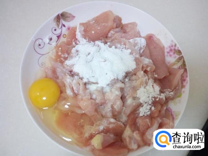把腌制好的鸡胸肉,放入2匙儿淀粉,再打入1个鸡蛋,然后用手抓匀挂糊。