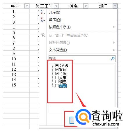 将除了管理和行政之外的小勾点掉,点击确认。第一步筛选完毕。