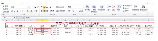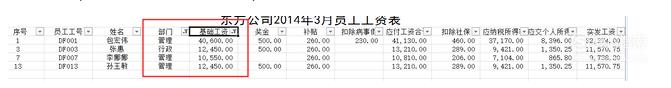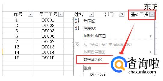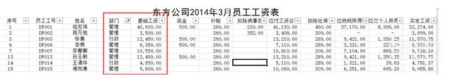 如我们需要知道管理和行政部门基础工资大于10000的人有哪些,首先点选部门后面的倒三角。