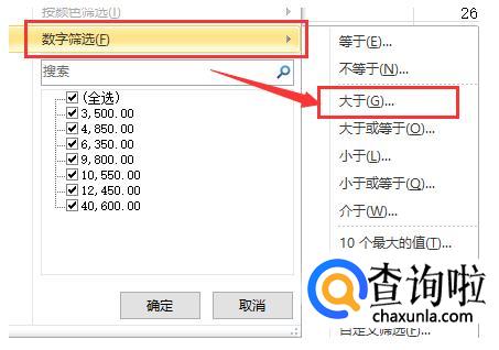 点选基础工资后面的倒三角,选择数字筛选,点击大于选项。