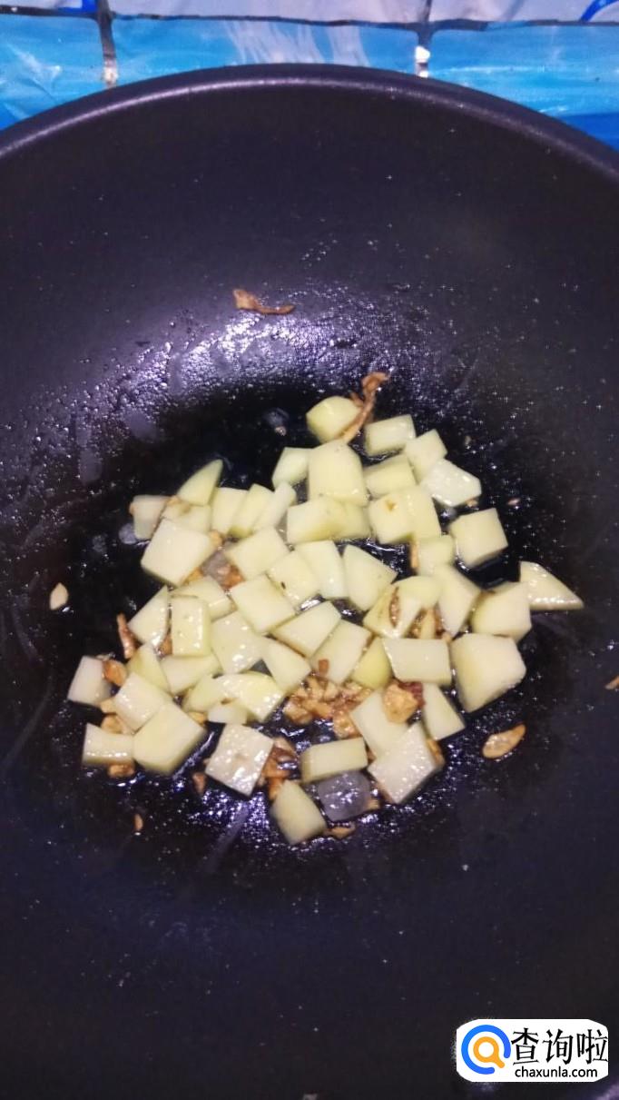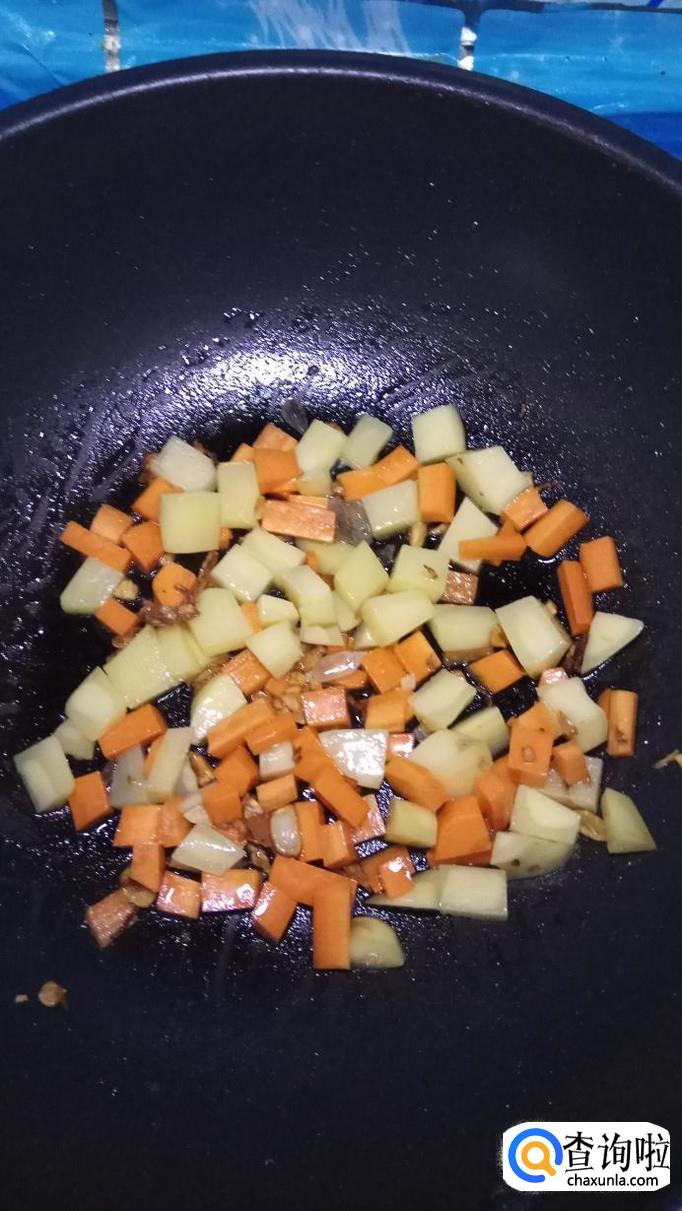 再将胡萝卜块儿倒入锅中,与土豆一起翻炒均匀。