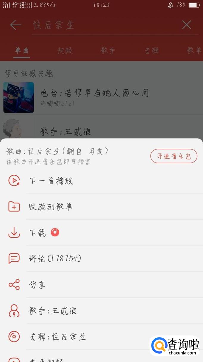 歌曲搜索出来以后,在最右边有三个竖点,点击那三个竖点,就会出现如下图所示的选项,点击下载,便可以下载歌曲了。