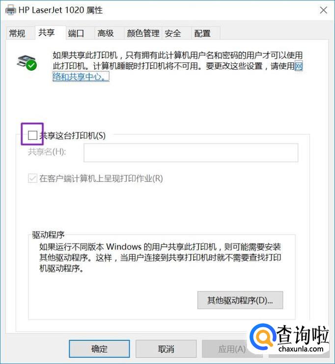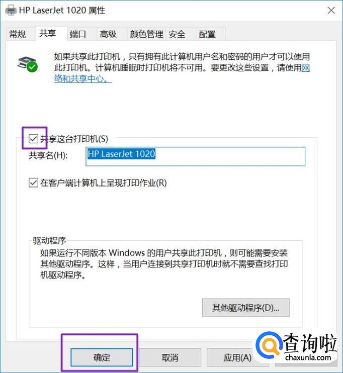 弹出的界面,我们将共享这台打印机给勾选上,然后点击确定,这样就共享了这台打印机了,别人通过搜索,找到这台打印机,就可以打印机了。
