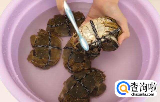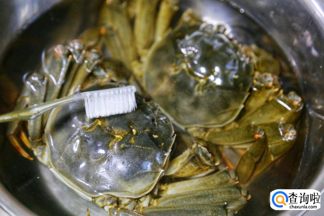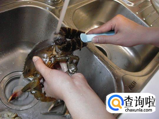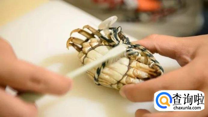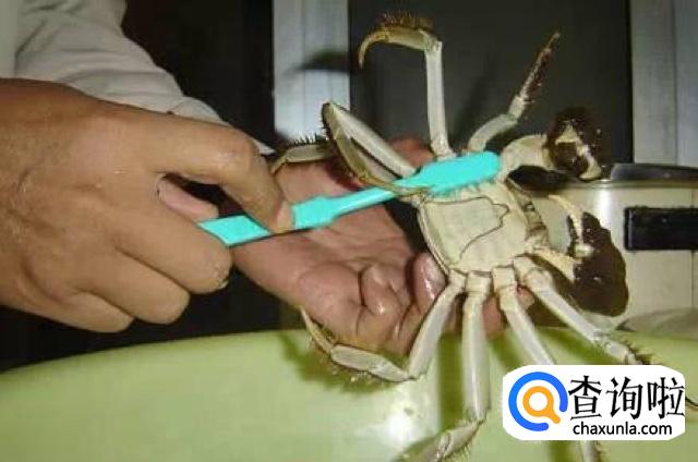 等螃蟹吐沙吐的差不多时,用牙刷先刷螃蟹的背部。