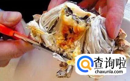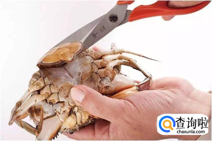 把背壳扔掉,因为内脏和蟹心都在上面,如果有蟹黄的,就把蟹壳中间的三角地带给去掉,没有蟹黄的,就全扔掉背壳吧,都没肉肉的。
