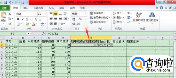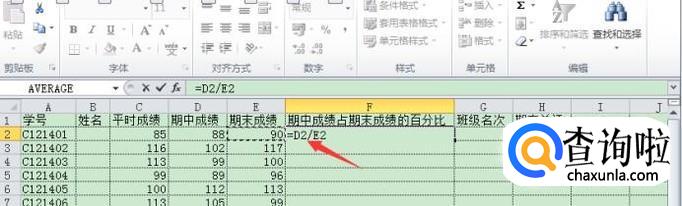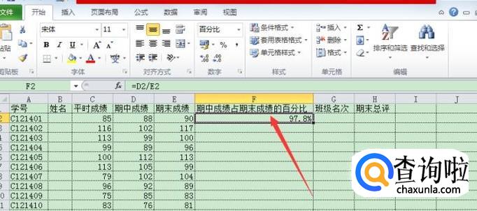 在此单元格根据数量关系输入公式,如图:=D2/E2,再按回车键得出结果