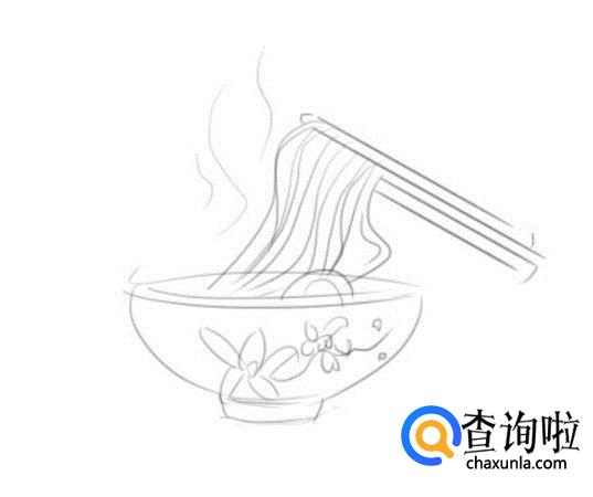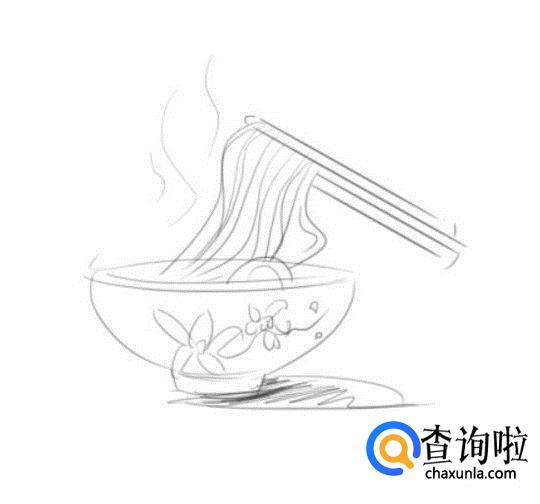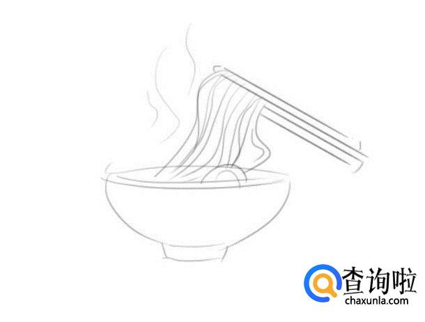接着我们把面条画出来,并且面条上面冒着热腾腾的气。再添上一双筷子就更生动了。