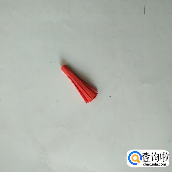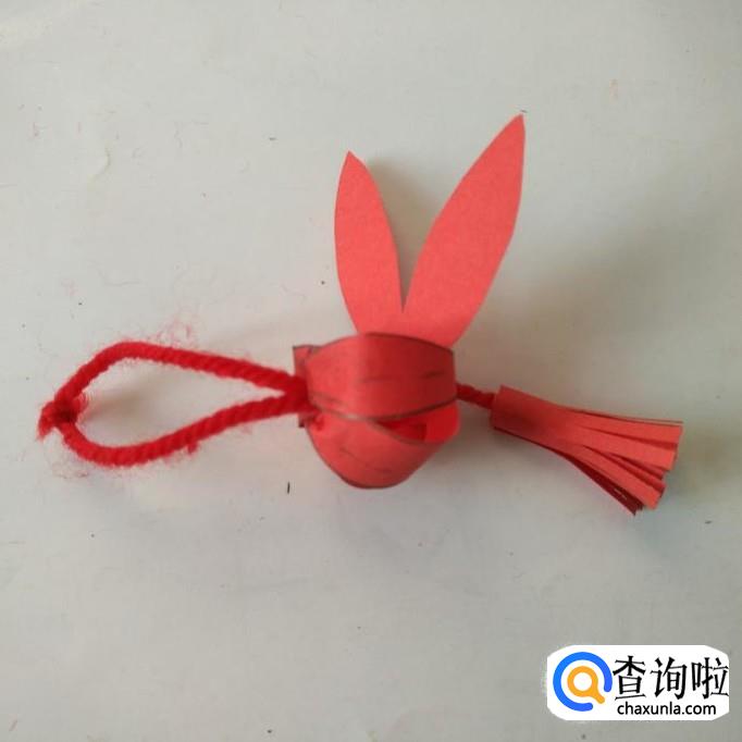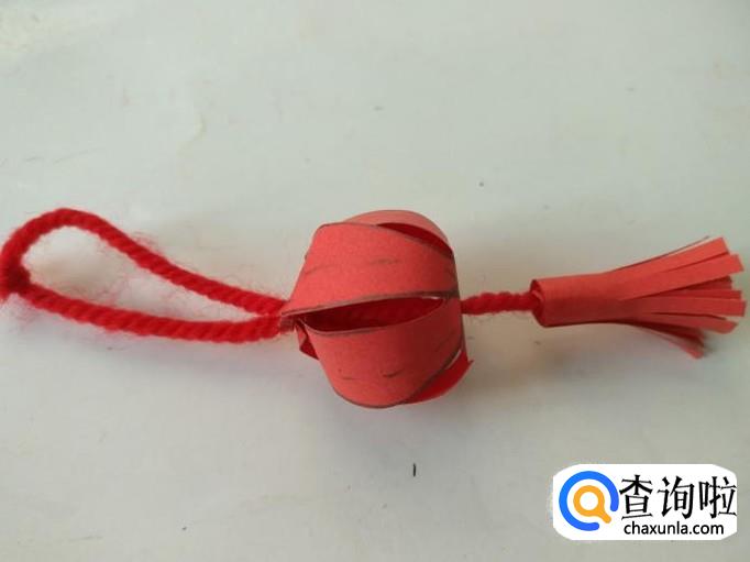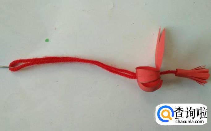 然后用针将红线穿好,先穿上穗头,再穿灯笼主体,最后将红线留出一段后打结固定。