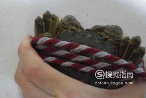 然后,我们将绳子线横着绑住螃蟹,先绑住一圈,绳子的一端在左手的食指和中指出固定。