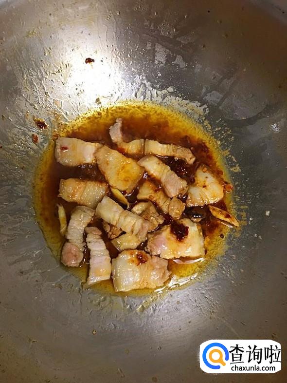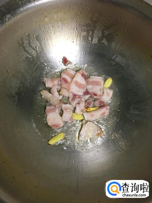 油锅烧热后,放入姜片爆香,然后放入五花肉片。