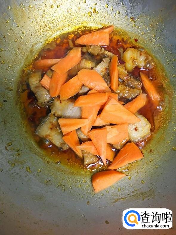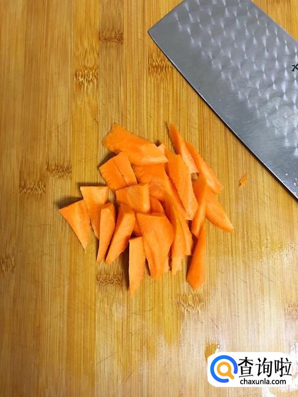 翻炒均匀后,加入切成小块的胡萝卜。