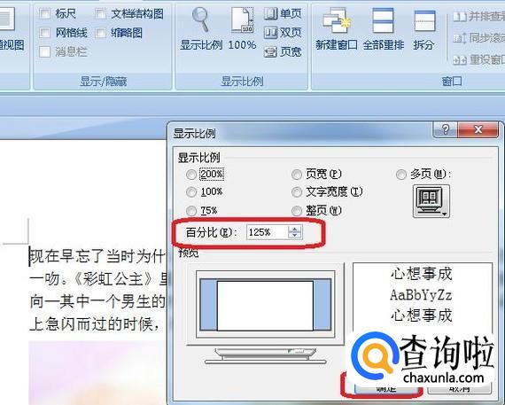 我们调整一下显示比例百分比,也可以在上方的选项中选择一下,这里,我就演示把页面设置成125%,选择完成之后,点击确定。