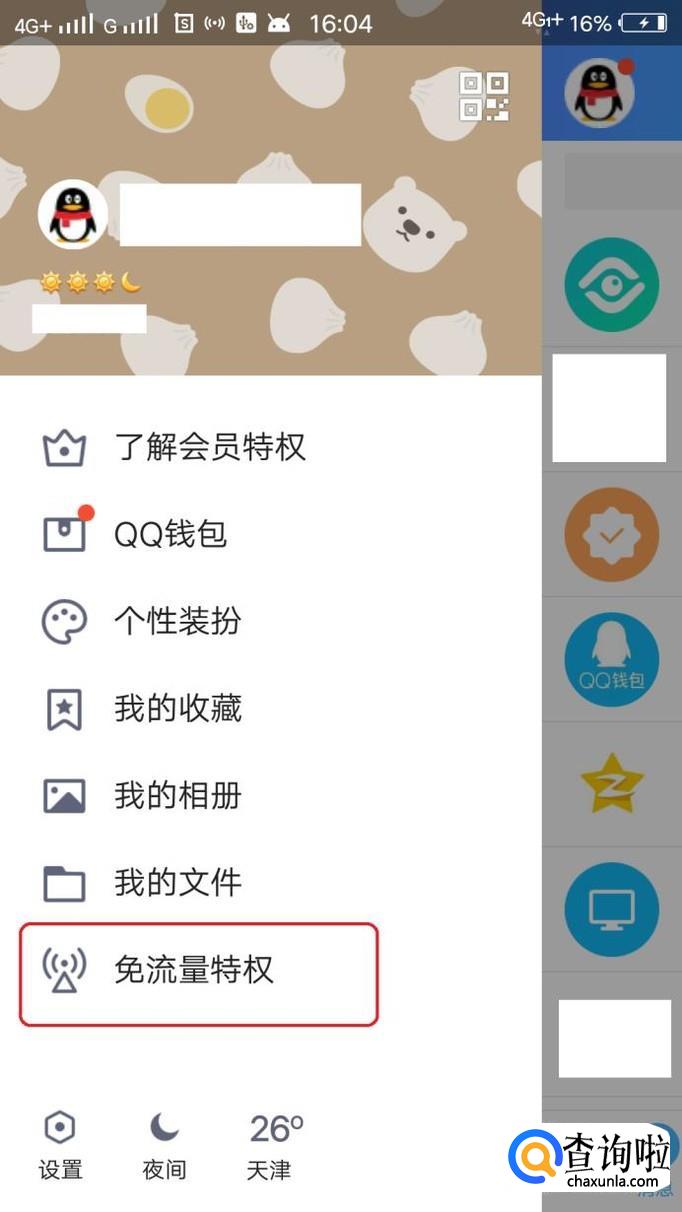 进入了个人页面,如图所示,我们点击“免流量特权”。