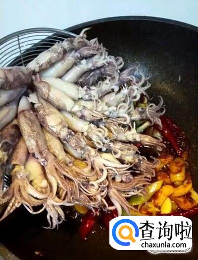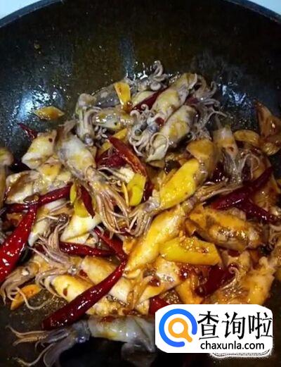 接着我们放入郫县豆瓣酱,葱姜蒜,再放入处理好的墨鱼仔,翻炒均匀