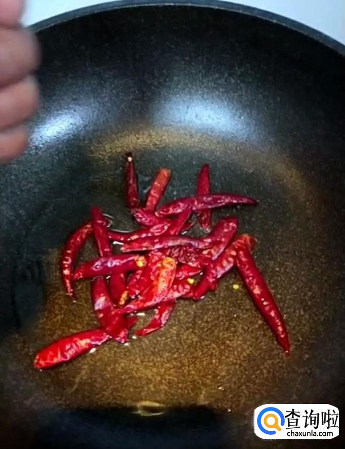 然后我们在锅中放入少许油,油热放入干辣椒,爆香