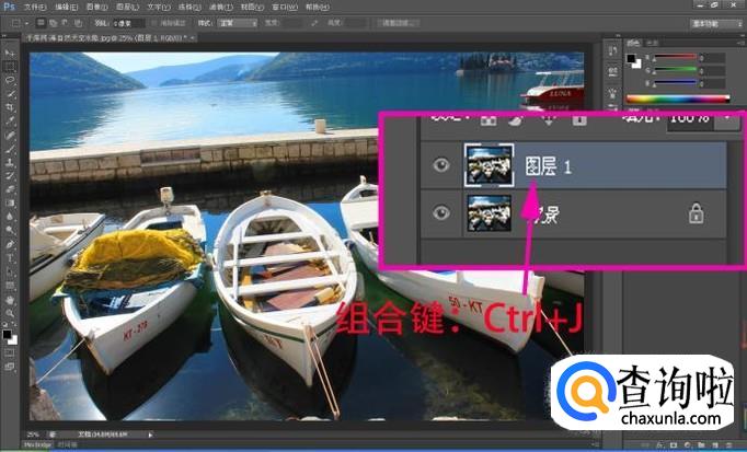 按组合键:“Ctrl+J”,复制“背景”图层,生成“图层1”;