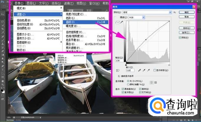 点击“图像-调整-曲线”命令选项,如图所示适当调整参数,将照片亮度提高;