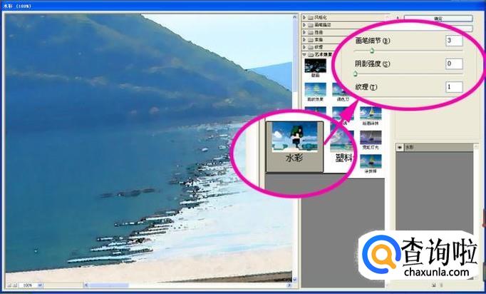 在菜单栏点击“滤镜-滤镜库”命令选项,在“艺术效果”类目中选择“水彩”效果,如图所示设置参数;