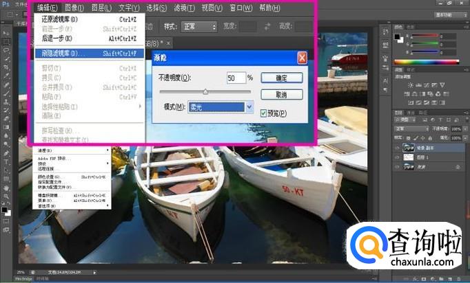接着点击“编辑-渐隐滤镜库”命令选项,将“不透明度”设置为“50”,“模式”为“柔光”;