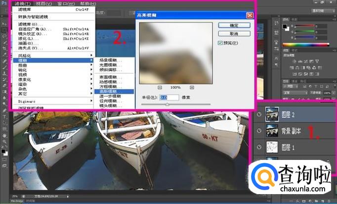 按组合键:Ctrl+Shift+Alt+E,盖印所有图层生成”图层2“,然后点击”滤镜-模糊-高斯模糊“命令选项,将”半径“设置参数为”9“;