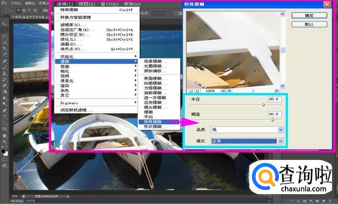 然后,点击“滤镜-模糊-特殊模糊”命令选项,如图所示,将“半径”设置为“80”,“阈值”设置为“90”,“模式”设置为“正常”;