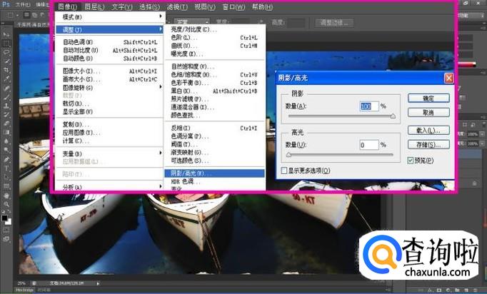 点击”图像-调整-阴影/高光“命令选项,将”阴影“参数设置为100%;