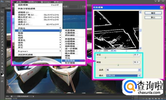 点击“滤镜-模糊-特殊模糊”命令选项,如图所示,将“半径”设置为“20”,“阈值”设置为“50”,“模式”设置为“仅限边缘”;