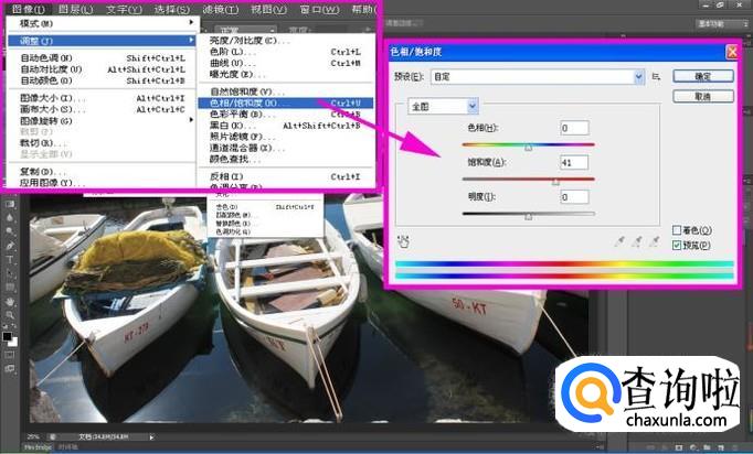 再点击“图像-调整-色相/饱和度”命令选项,调整饱和度参数,让照片色彩变得鲜艳一些;