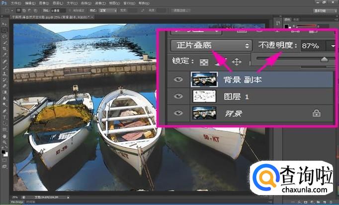 将“背景副本”图层的“图层混合模式”设置为“正片叠底”,“不透明度”设置为“87%”;