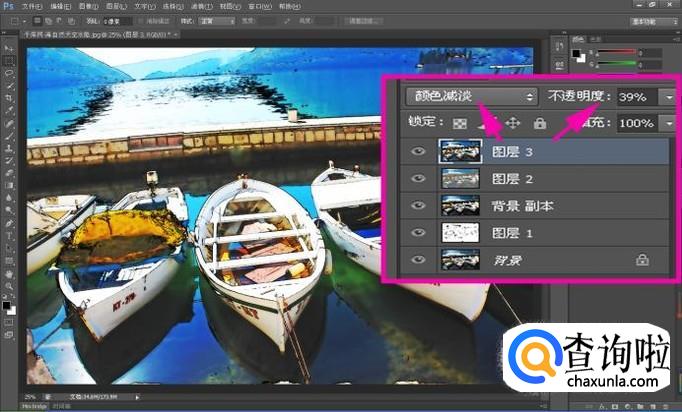 按组合键:Ctrl+Shift+Alt+E,盖印所有图层生成”图层3“,并且将图层混合模式设置为”颜色减淡“,不透明度设置为”39%“;