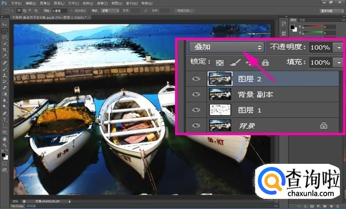 将”图层2“的图层混合模式设置为”叠加“,将强照片图像效果;