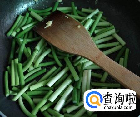 锅中放入食用油,烧热后,放入蒜薹,翻炒均匀。