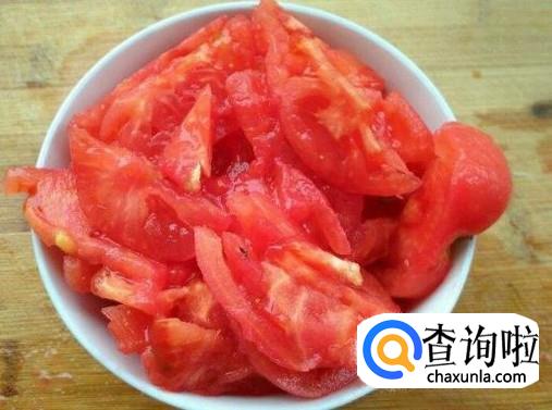 将西红柿去皮,将蒜薹去掉尾部的苗,用刀切成寸段。