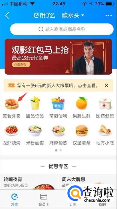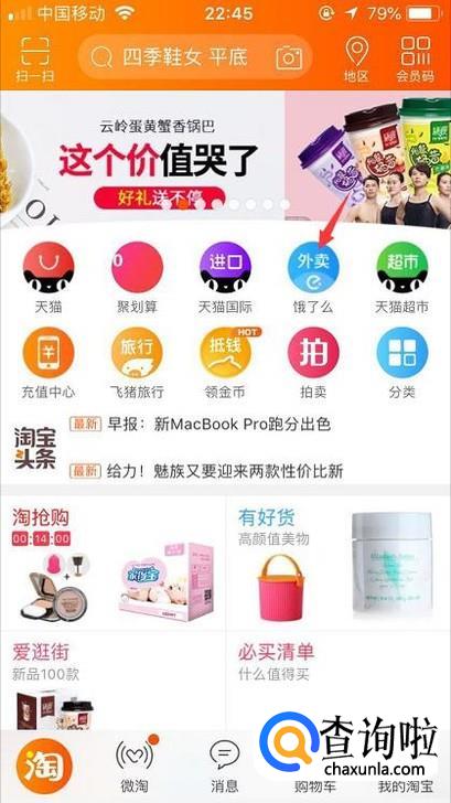 首先我们先打开淘宝软件,在淘宝的首页会看见有一个外卖的入口。
