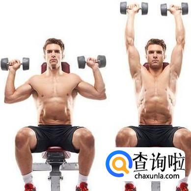 哑铃肩上推举。挺胸、收腹,身体直立,双手握紧哑铃,让大臂和小臂保持90°的角度,向上推举时吸气,向下时呼气。