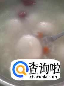 继续用中火煮两三分钟左右,用汤勺轻轻地推动小汤圆,防止其粘锅,然后加入准备好的枸杞和冰糖。