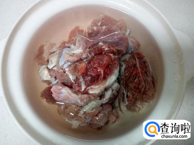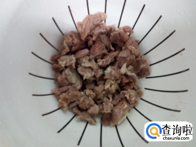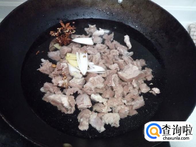 把切好的牛肉放入冷水锅中烧开,水开后煮一分钟的时间捞出,用冷水冲洗干净(血水和沫子),沥干水分。