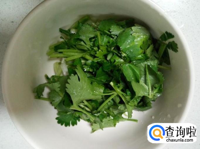 香菜收拾清洗干净,切成小段。另切些葱备用。