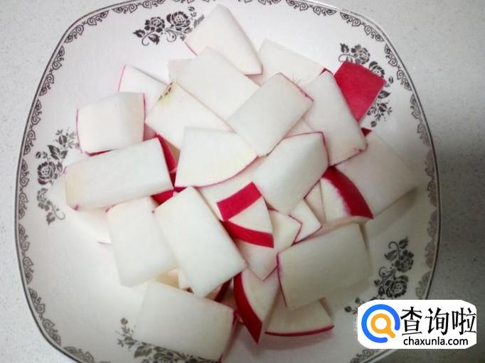 红萝卜用水清洗干净,控干水分,切成块。