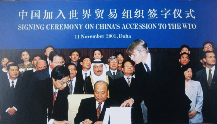 2001年12月11日,中国正式成为世贸组织成员。2001年中国加入世界贸易组织,是中国深度参与经济全球化的里程碑,标志着中国改革开放进入历史新阶段。加入世贸组织以来,中国积极践行自由贸易理念,全面履行加入承诺,大幅开放市场,实现更广互利共赢,在对外开放中展现了大国担当。