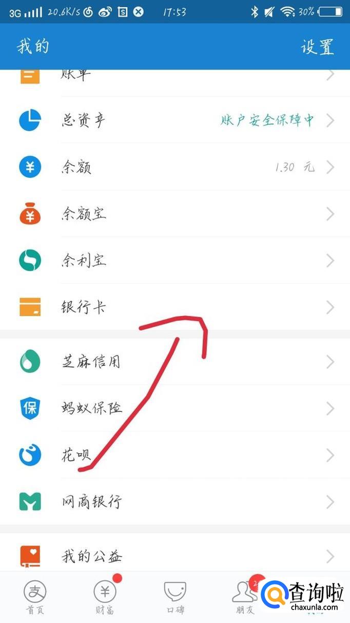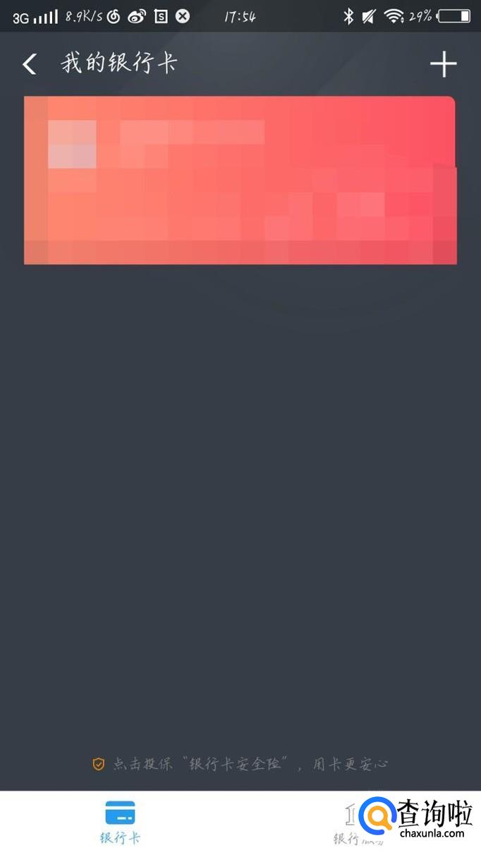 向下滑动手机,点击“银行卡”选项,如图1箭头所示。会出现一个新的界面,如图2所示。