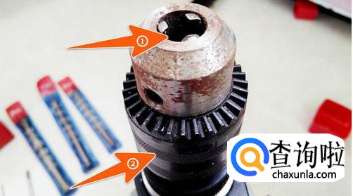 把电钻立起来放,握住下面带齿的转环将它拧松,可以看到钻头上的咬合嘴就会松开。