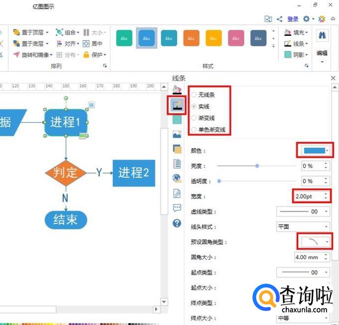 然后是“线条”,这个属性比较多,主要是修改颜色、宽度和圆角等等;