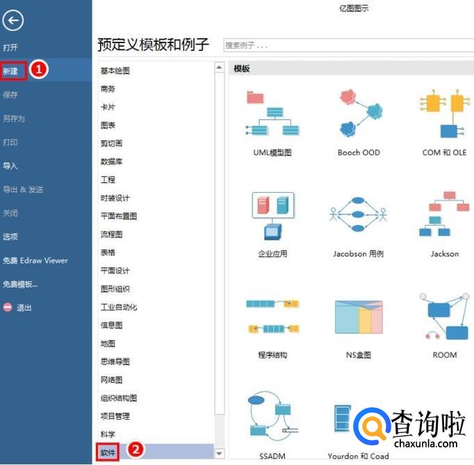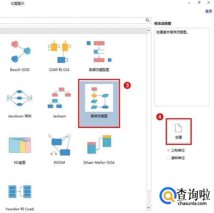 打开软件,新建,在“预定义模板和例子”中找到软件,选择“程序流程图”,点击“创建”;