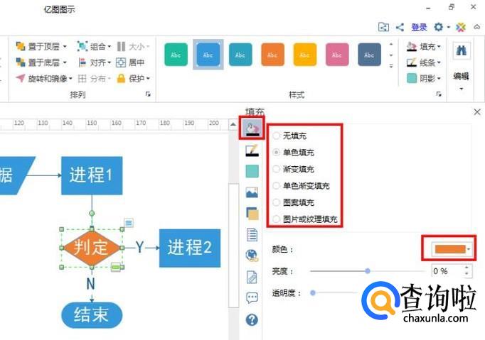 流程图整体布局设置好以后,接下来可以对每个块的属性进行设置,首先是“填充”,填充样式、颜色、亮度和透明度均可修改;