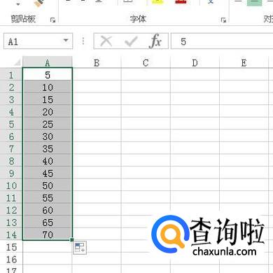 鼠标点住A2右下角的填充柄,再向下拉,即可自动填充上以5为单位递增的序列。