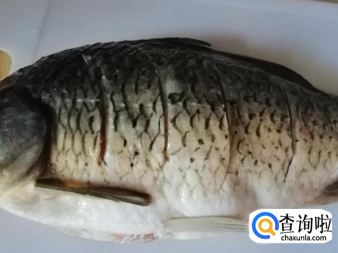 把处理好的鱼,用刀在鱼身上划几刀如图所示,鱼两面都划好后撒上食盐料酒腌制一会。